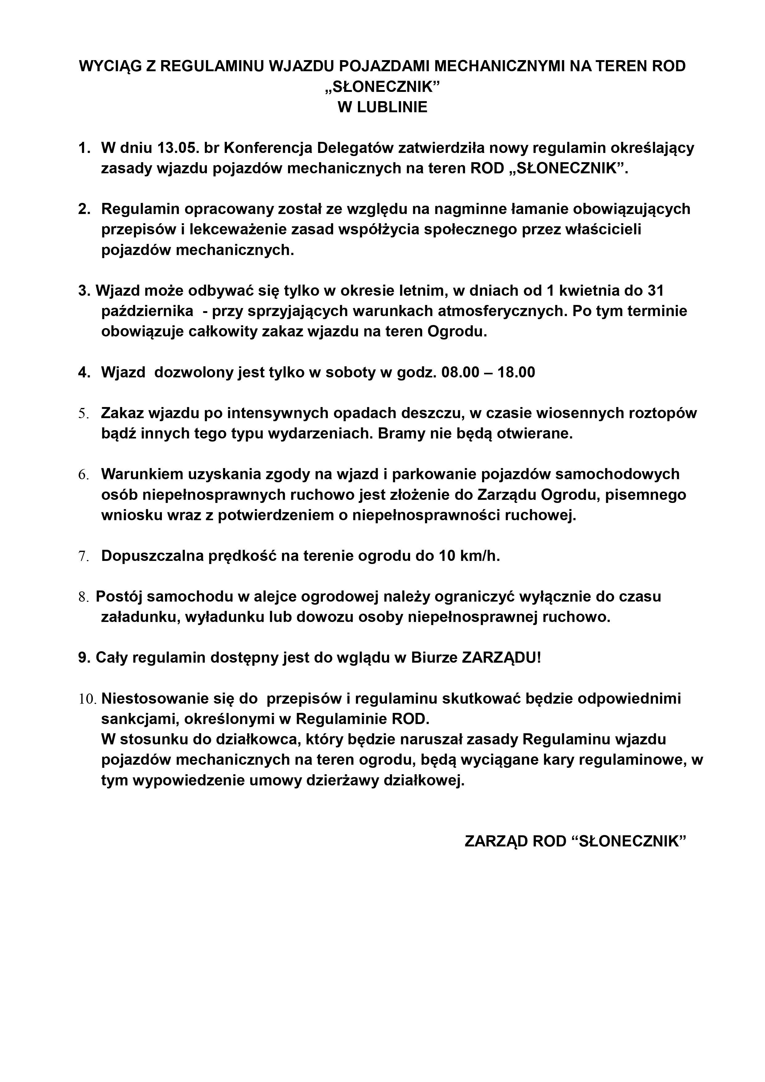 Prosimy o zapoznanie się z regulaminem wjazdu pojazdów mechaniczych na teren ROD "Słonecznik" w Lublinie